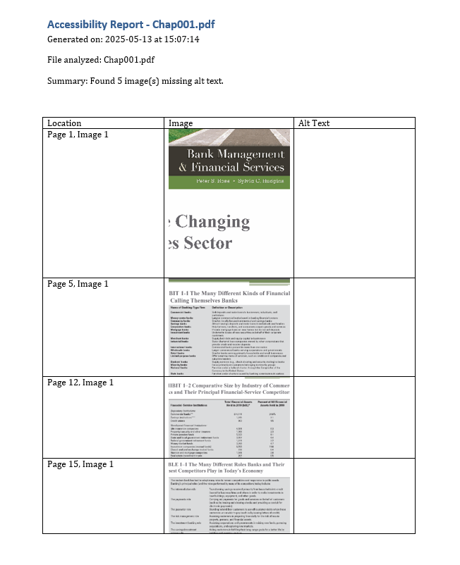 Created a Python tool that extracts images missing alt text from PDFs, Word docs, and PPTs, producing a receipt that SMEs can complete and return for quick remediation.